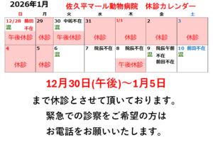 ★12/30 午後(~17:00) 12/31〜1/5(9:00~17:00)急患のみ対応可能です。
