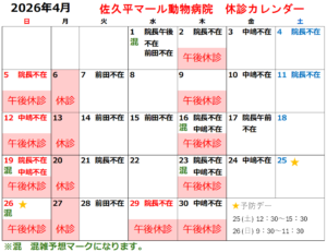 この他、臨時休診、獣医の臨時不在等ある場合がございます。ご了承ください。